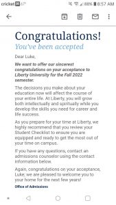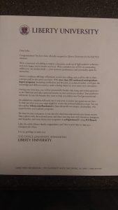 Monday was a dreary, rainy day that made the rest of the week seem wonderful. Throughout the day it was cloudy and glum, however, right at the start of our band rehearsal is when it started to rain. It wasn’t too heavy of rain, but when you stand out in the rain for an hour and a half straight, it gets you pretty wet. By the end of rehearsal, everyone was giving each other wet hugs and flicking more water onto each other; it was a good time and a great rehearsal, despite being waterlogged. (Shoutout to Kara for helping make sure I didn’t slip and die walking back up to the school with my wet glasses.) I got a welcome box from Liberty University including a t-shirt, a poster, and my official acceptance letter from the school! That was an excellent surprise to come home to after being drenched, and I safely stored away my acceptance letter for safekeeping and hung my t-shirt with my two other Liberty shirts.